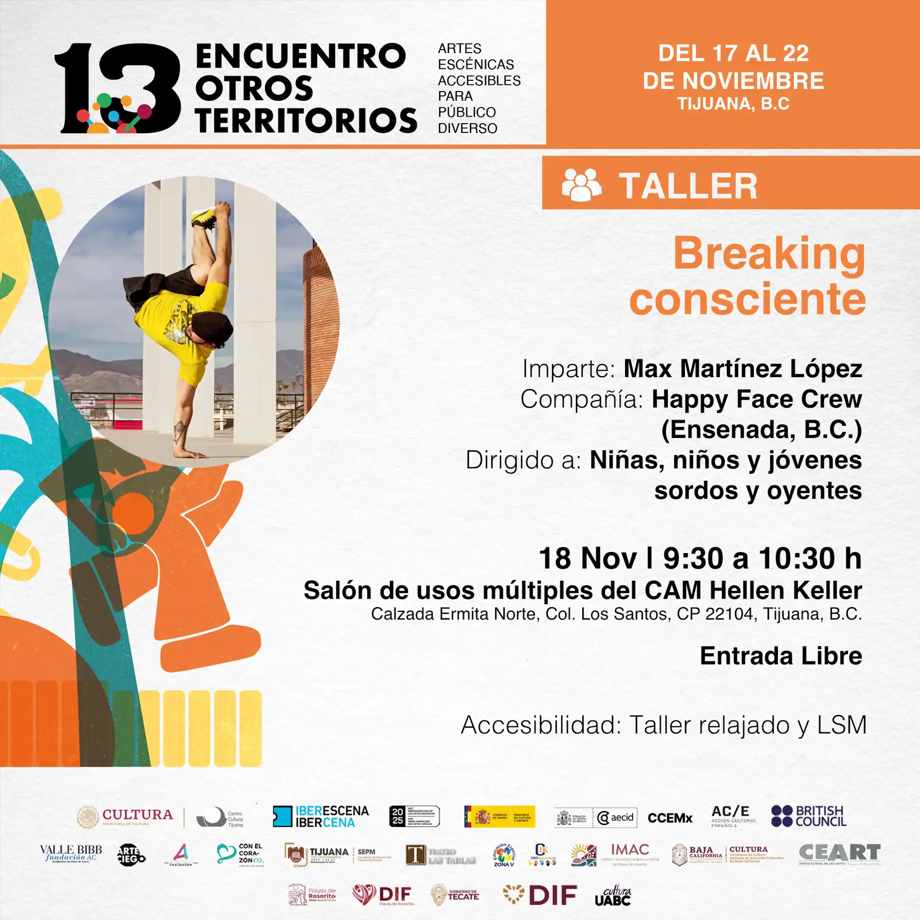 Fecha y Hora – Titulo: 11 y 12 de noviembre, 11:00 a 14:00 h – Taller de Teatro Inclusivo: El cuerpo y la voz en juego Compañía: Compañía de Teatro Paladio (España) Dirigido a: Personas con y sin discapacidad, de 10 años en adelante. Duración: 6 horas totales (2 sesiones de 3 horas cada una). Sede: Taller 4A del Centro Cultural España en México (CCEMX), CDMX. Accesibilidad: Lugar arquitectónicamente accesible. Se contará con Intérprete en Lengua de Señas Mexicana (LSM) si hay personas sordas, y Audiodescripción si hay personas ciegas.